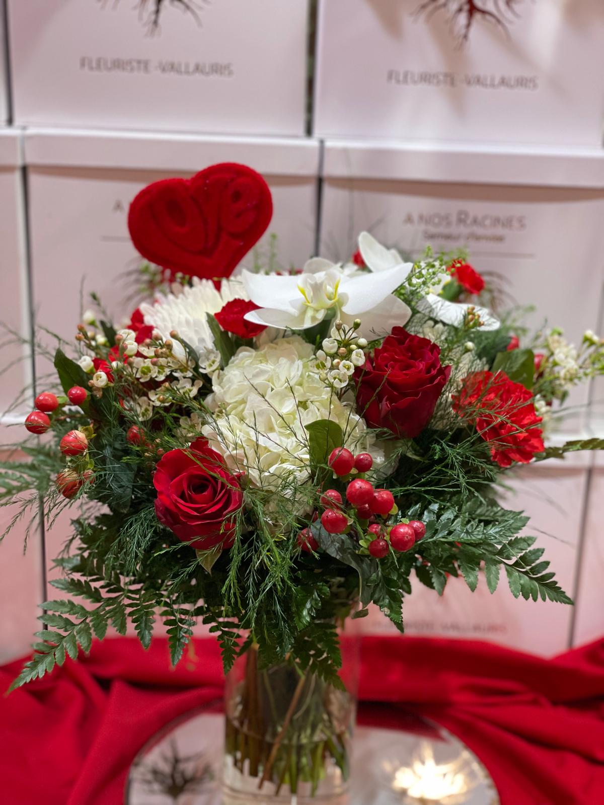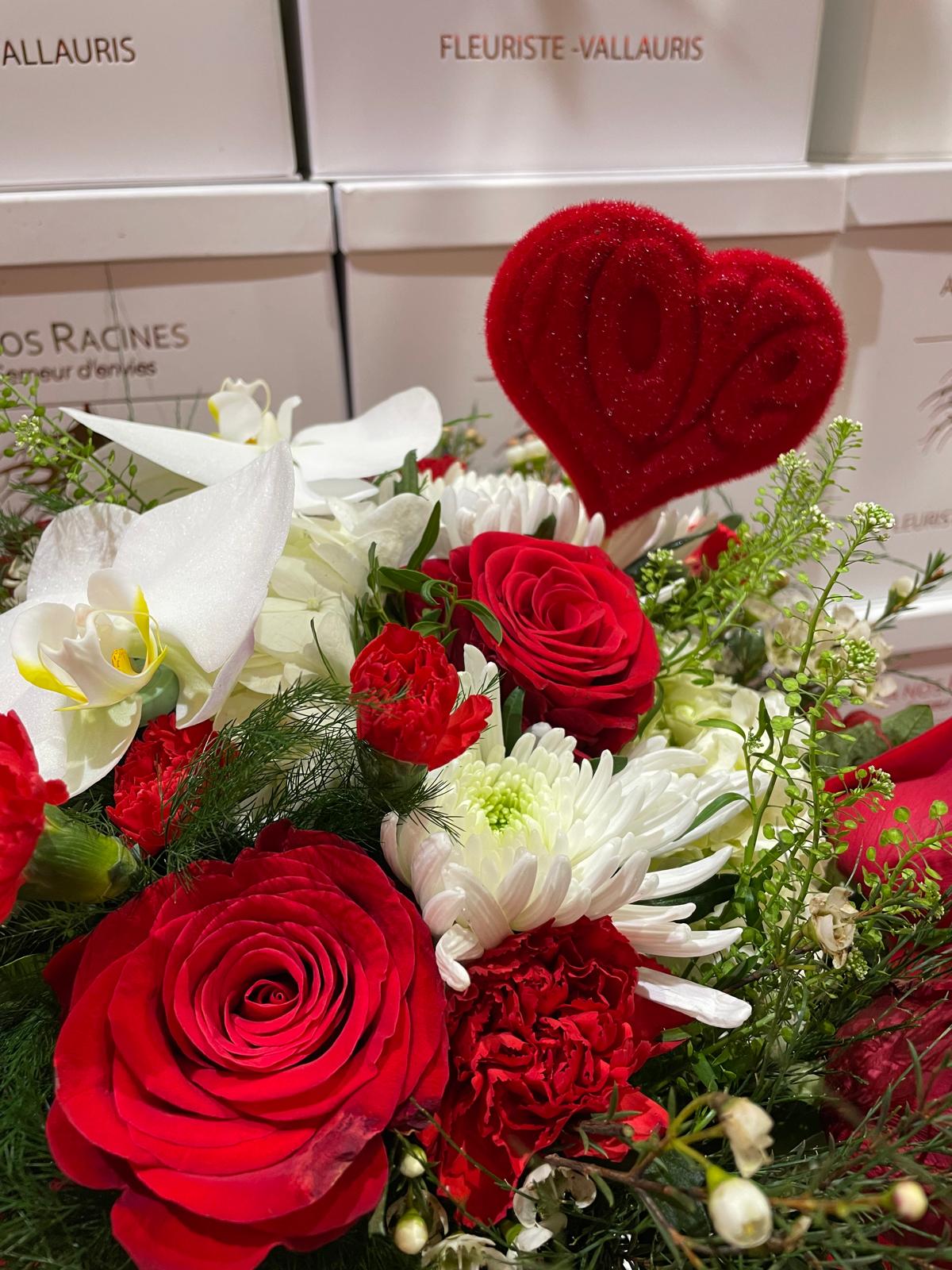 Roses rouges et fleurs blanches lumineuses, sublimées par un cœur velours.