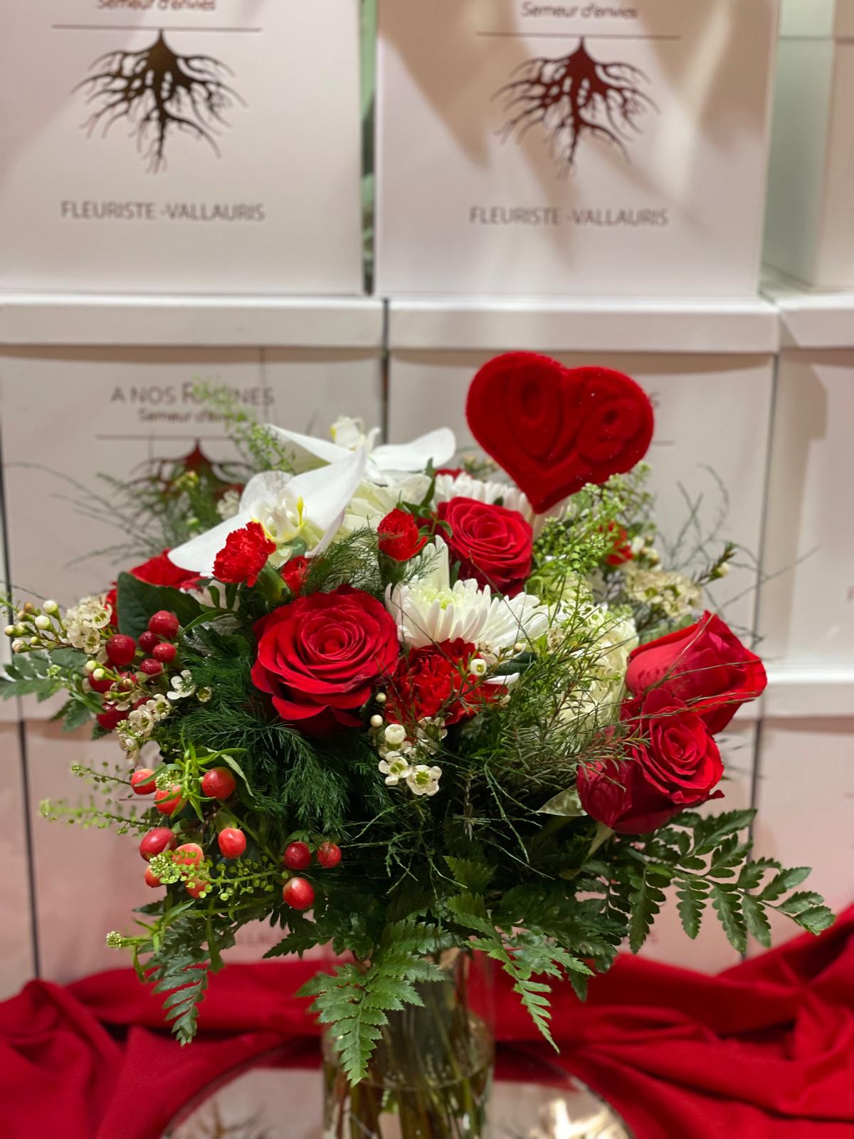 Roses rouges et fleurs blanches lumineuses, sublimées par un cœur velours.