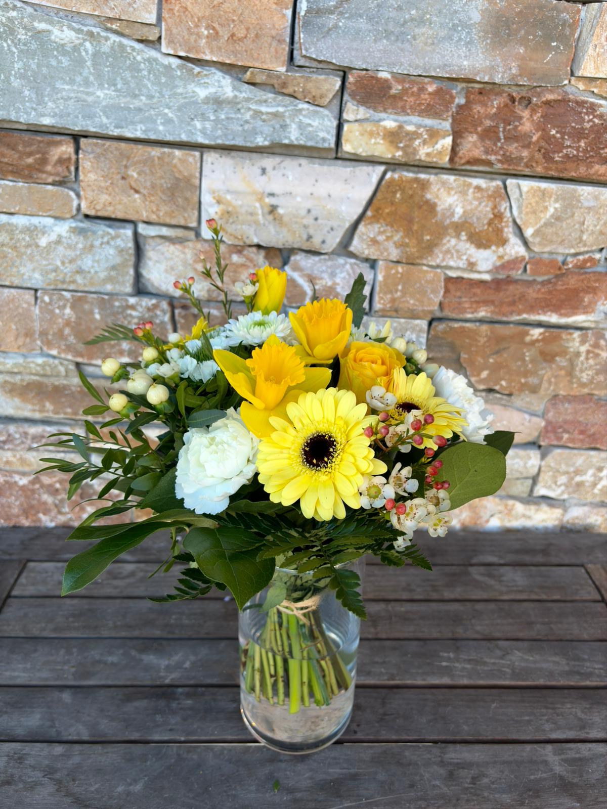 Comme un air de printemps dans un bouquet avec ses fleurs de saison de couleurs blanches et jaunes.