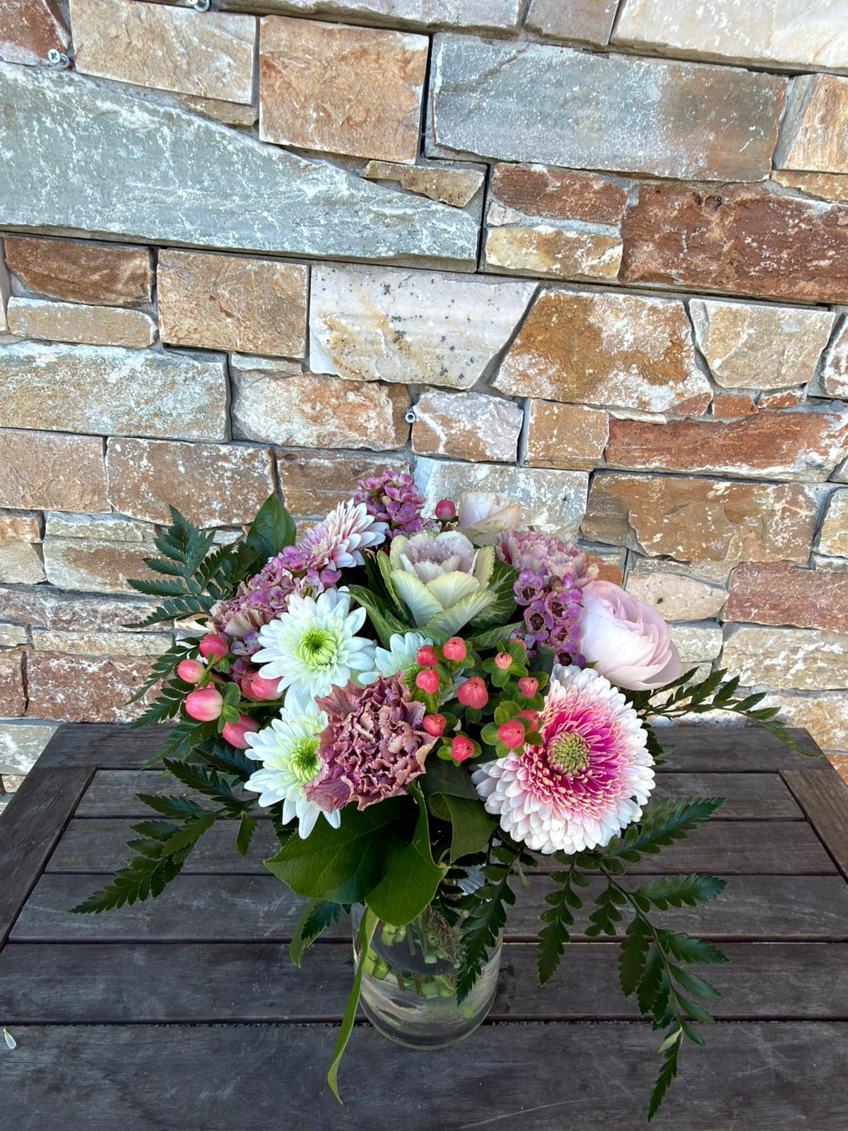 Bouquet avec ses fleurs couleurs pastel et blanc.