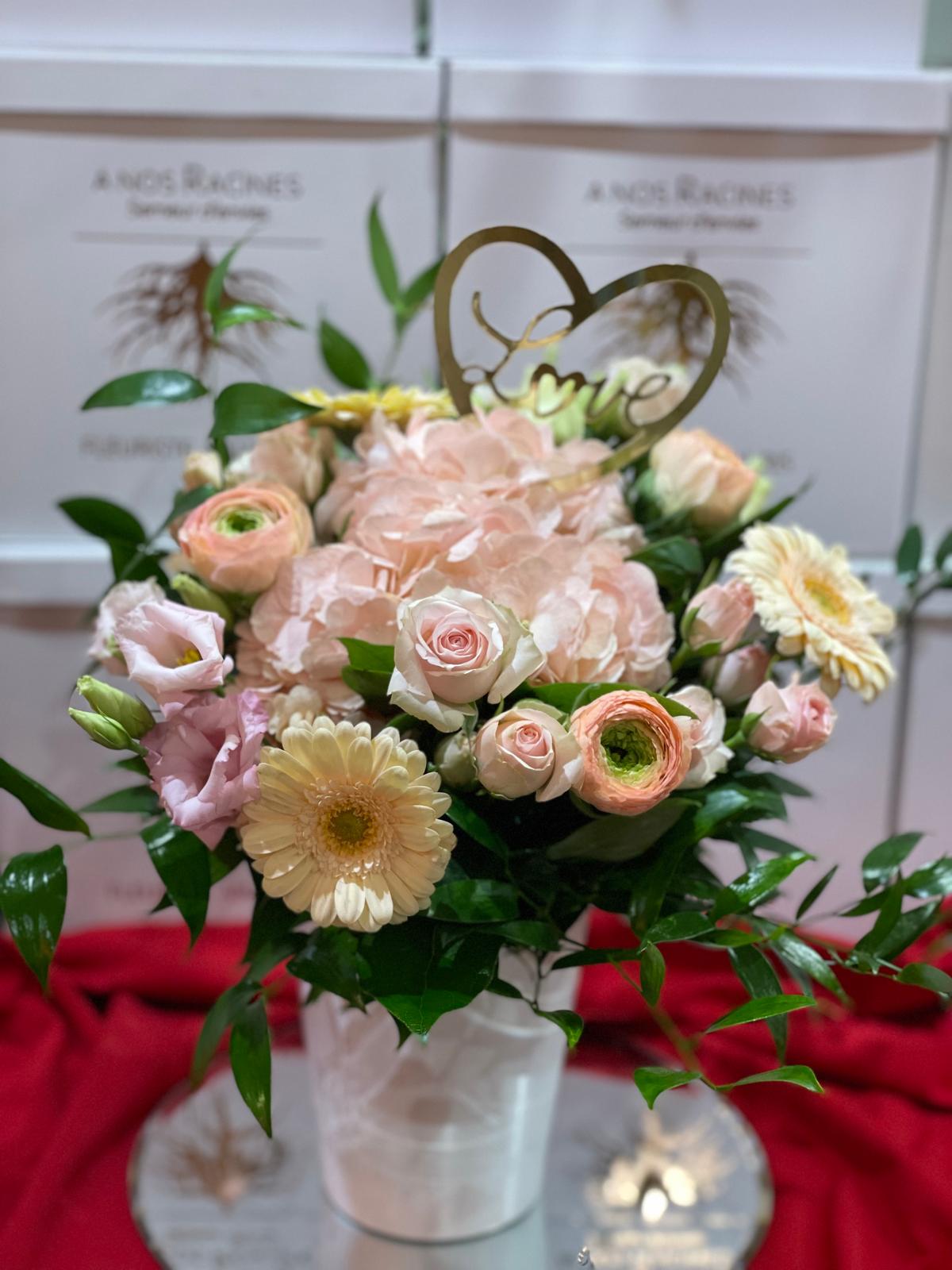 Roses blush, hortensia pastel et fleurs délicates dans une harmonie douce et raffinée.