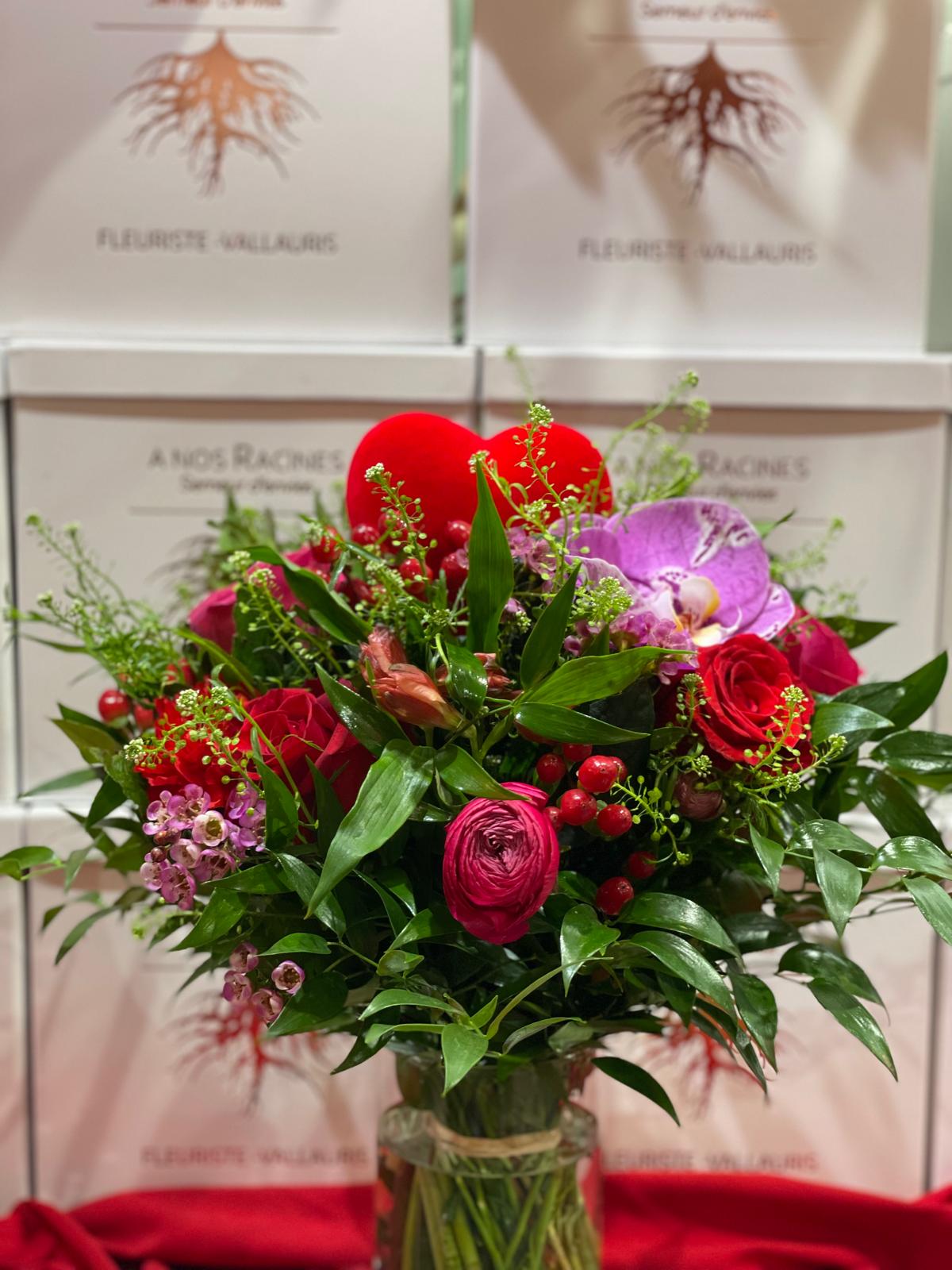 Rose intense, rouge profond et feuillage vibrant, signé d’un cœur romantique.