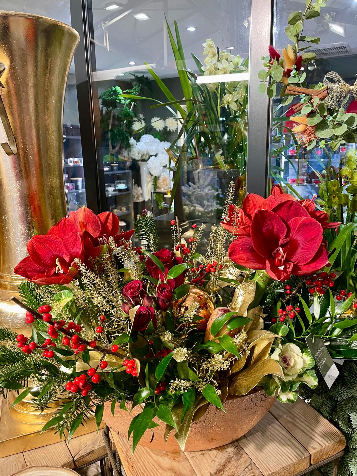 Composition d’amaryllis rouges, de roses rouges, de chou décoratif, de baies d’ilex et de sapin, accompagnée de feuillages de saison et d’éléments décoratifs dorés.