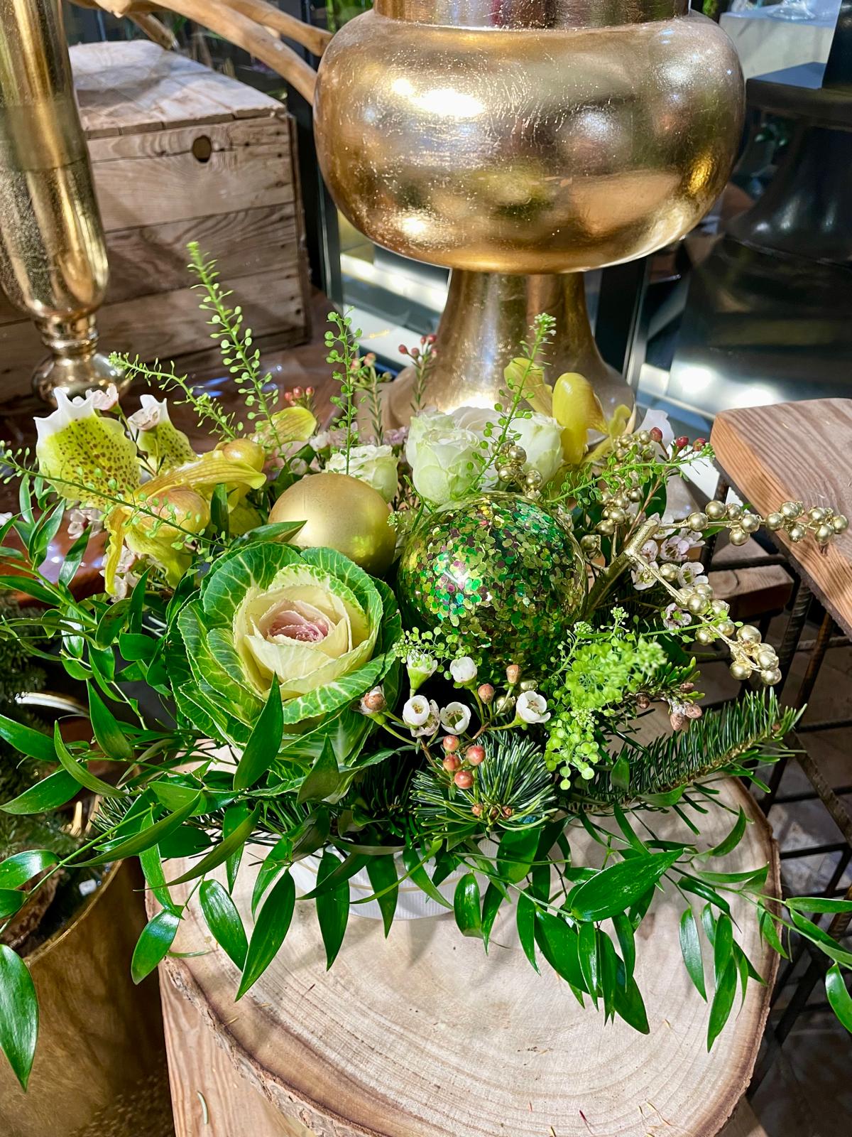 Composition de roses blanches, de chou décoratif, de baies décoratives et de sapin, accompagnée de feuillages de saison et d’éléments décoratifs dorés.