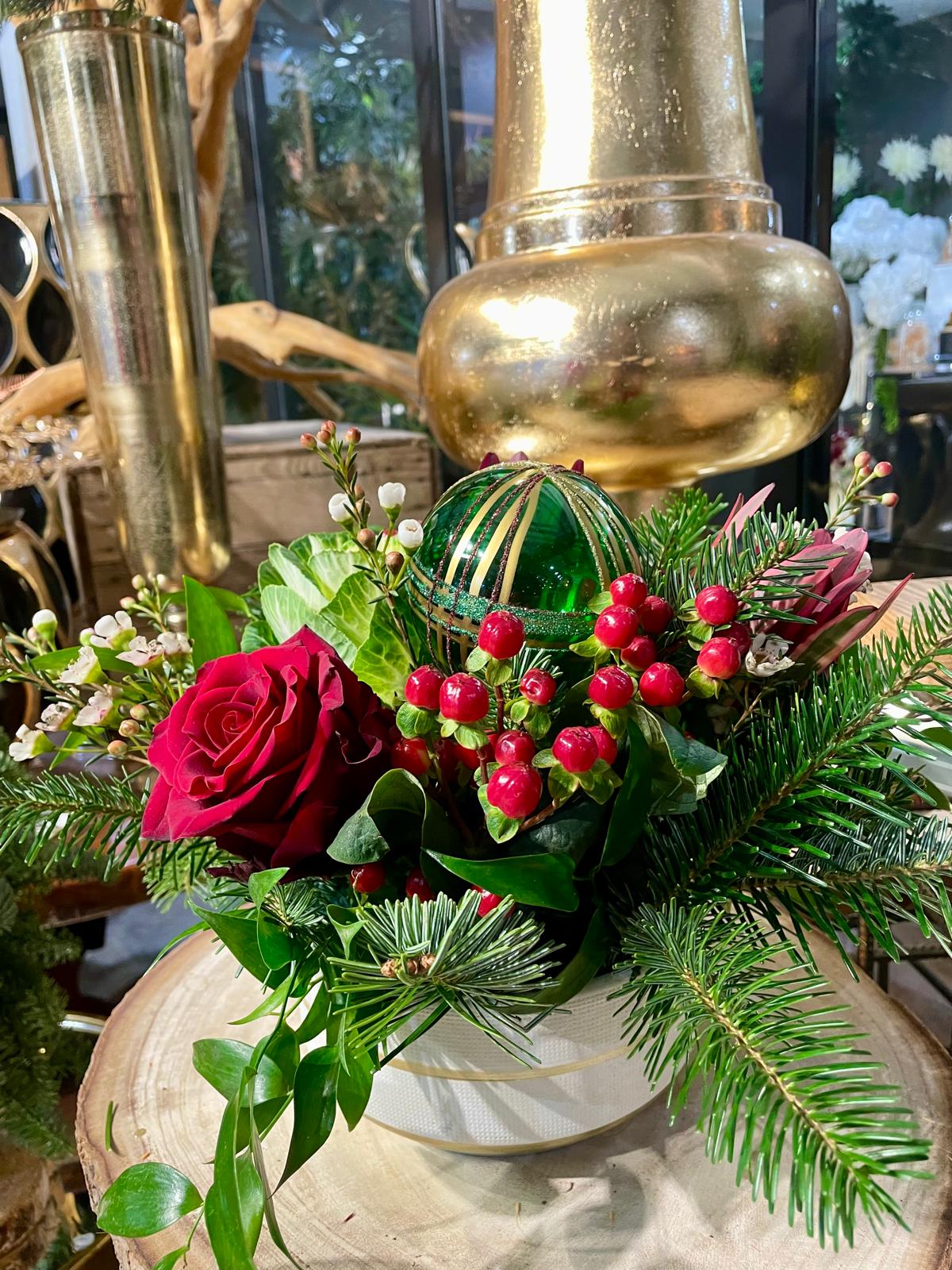 Composition de roses rouges, de chou décoratif, de baies d’ilex et de sapin, accompagnée de feuillages de saison et d’un élément décoratif vert.