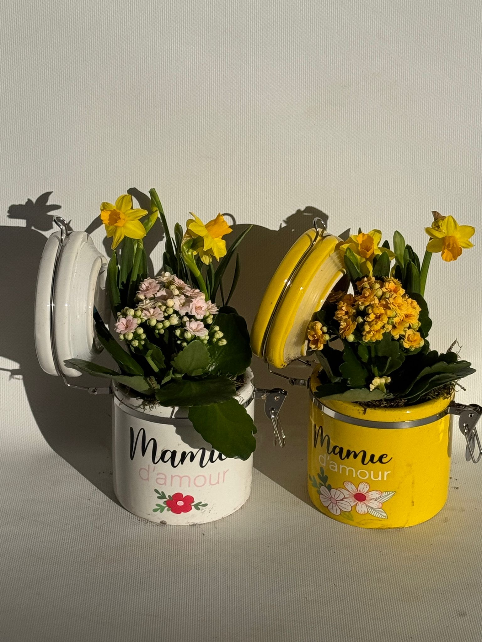 Une création pleine de tendresse dans son pot “Mamie d’amour”. Narcisses lumineux et fleurs délicates pour célébrer Mamie avec douceur et fraîcheur.