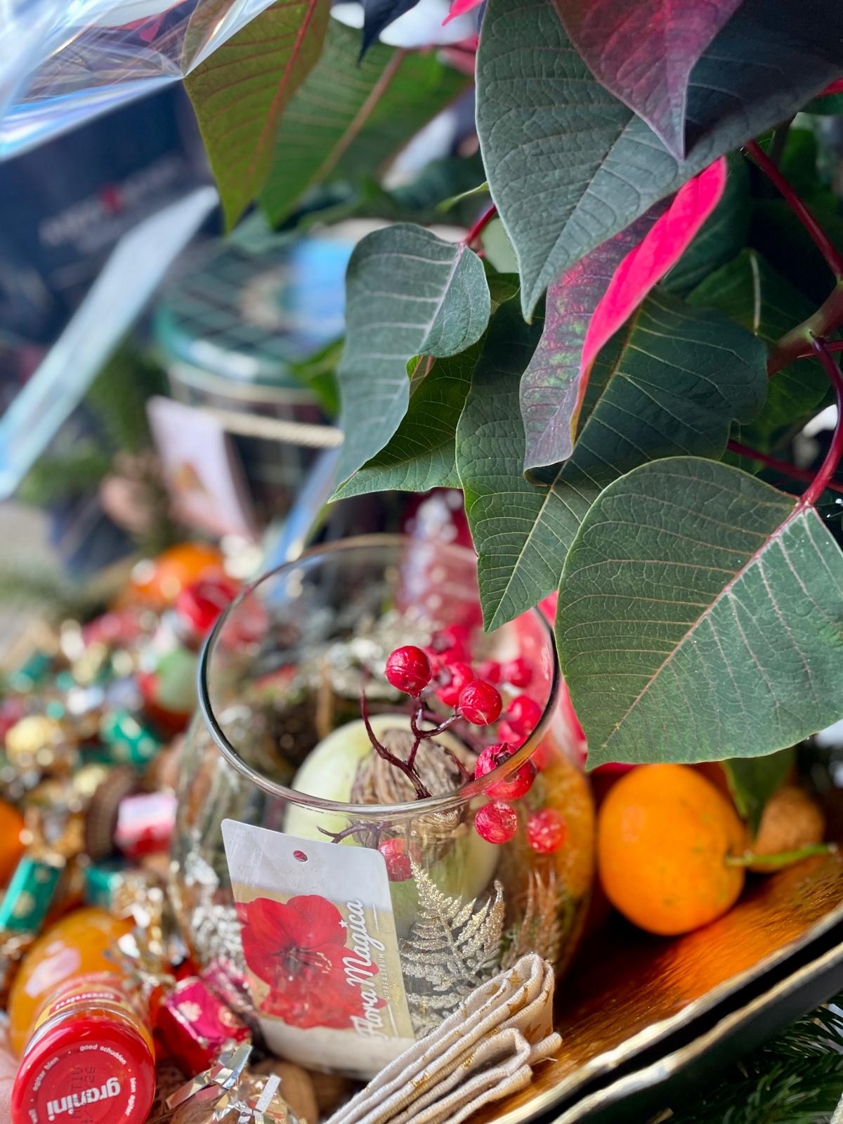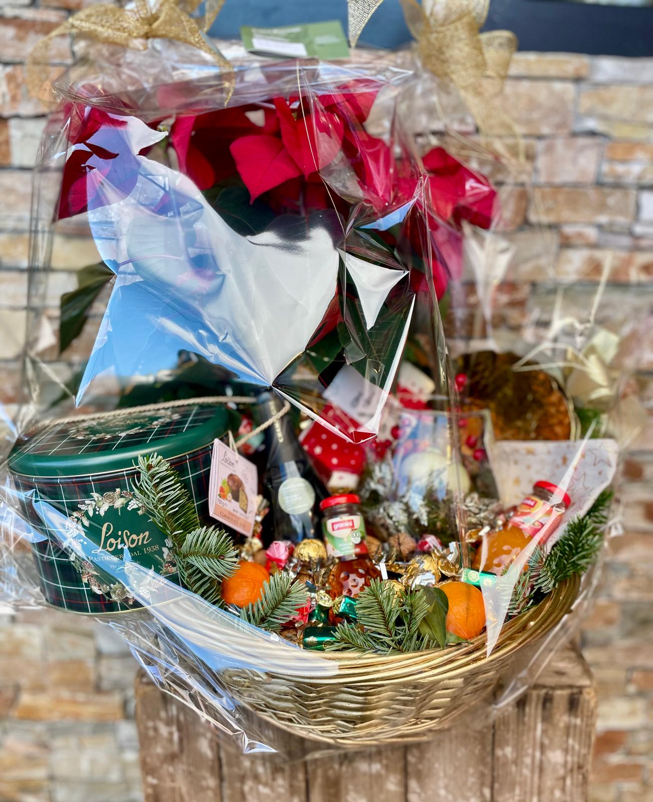 Panier cadeau personnalisable avec plante, panettone, champagne, chocolat, peluche.