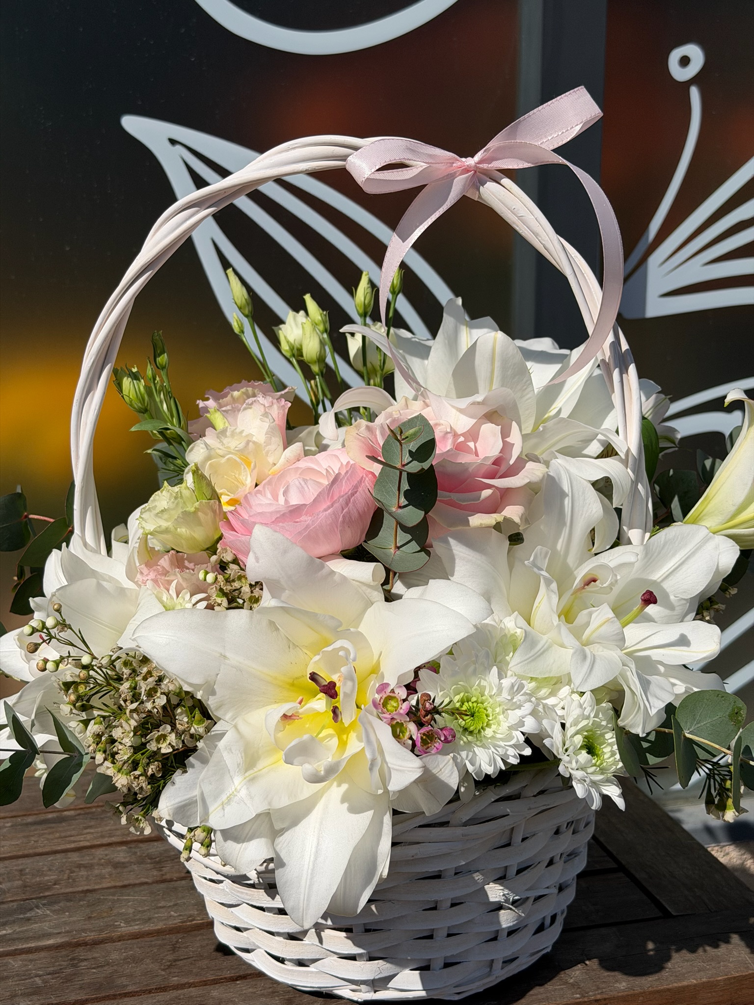 Composition en panier blanc, mêlant fleurs blanches et rose poudré avec feuillage léger.